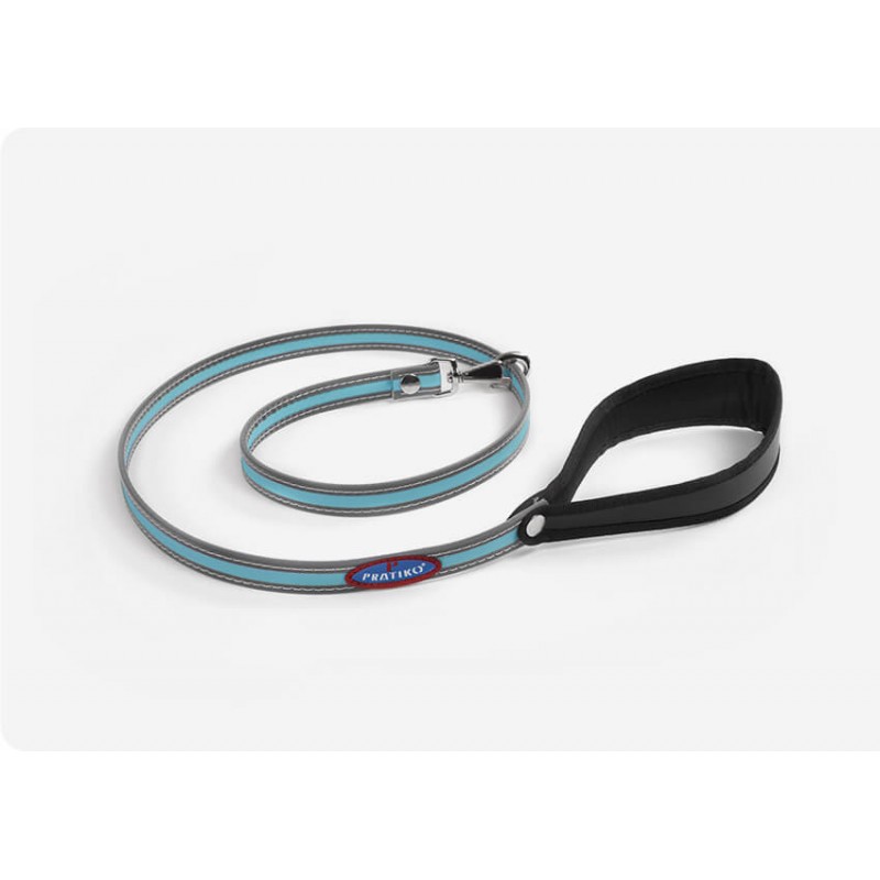 Il guinzaglio bordato con fettuccia è dotato di una morbida impugnatura in neoprene nero, materiale idrorepellente ed estremamente elastico e resistente. E’l’ideale per rispondere alle esigenze di praticità, sia del 4 zampe, sia di chi lo conduce. Il guinzaglio è abbinabile con tutte le tipologie di pettorine della linea Pratiko. E ‘destinato principalmente aio cani di piccola e media taglia. La lunghezza dell’accessorio è di 115 cm. Il guinzaglio è realizzato in Italia con materiali di origine italiana certificata.