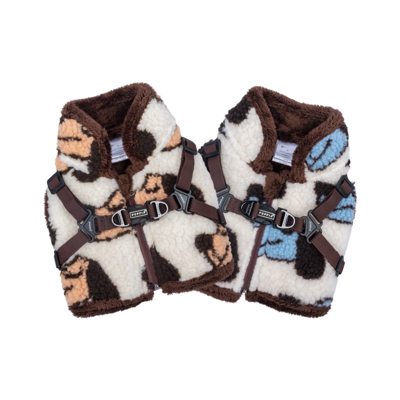 Pettorina sicura e alla moda a gilet modello V, motivo a cagnolini e tinta unita, circonferenza collo e torace regolabili