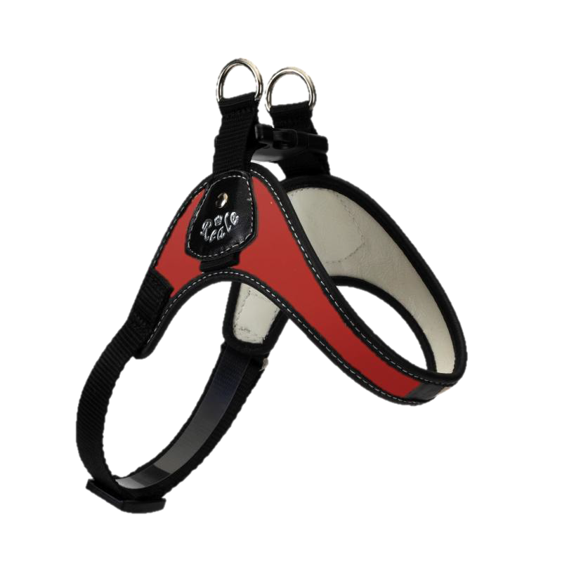Pettorina realizzata in pelle sintetica con bordino laterale antirritazione; con chiusura sopra il dorso mediamte fibbie a scatto mentre la regolazione è sottopancia!