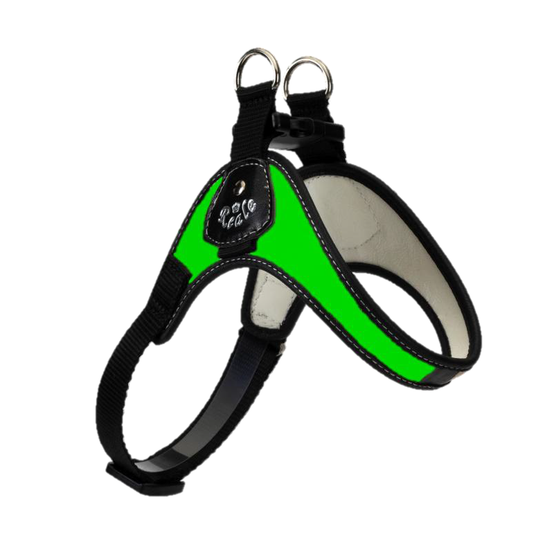Pettorina realizzata in pelle sintetica con bordino laterale antirritazione; con chiusura sopra il dorso mediamte fibbie a scatto mentre la regolazione è sottopancia!