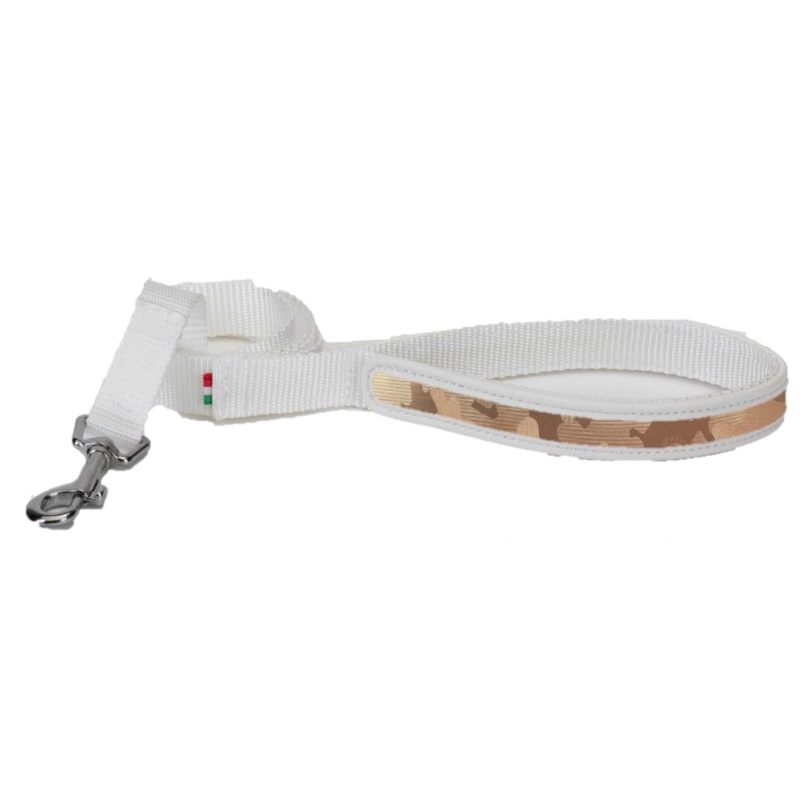 Realizzato in corda nylon nera/bianca antistrappo in lunghezza standard 120cm con moschettone metallico nichel free ad elevata resistenza.