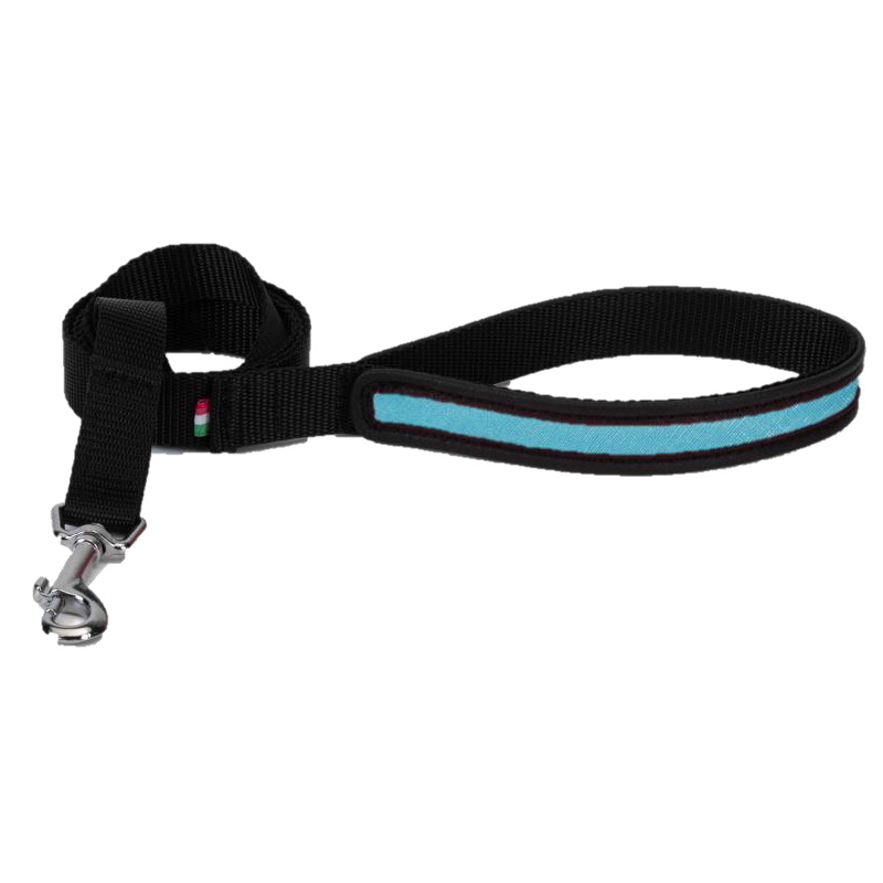 Realizzato in corda nylon nera/bianca antistrappo in lunghezza standard 120cm con moschettone metallico nichel free ad elevata resistenza.