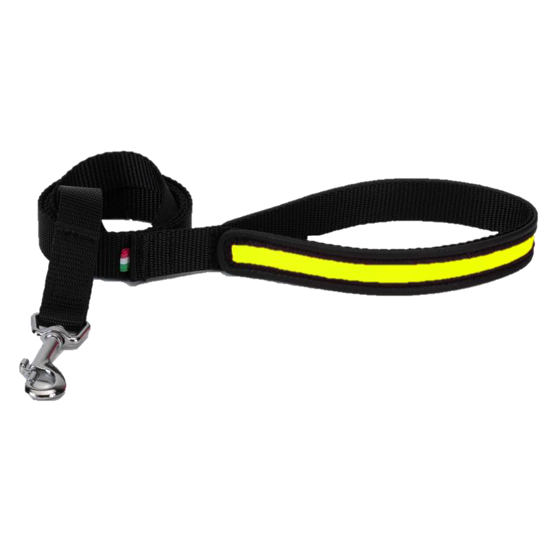 Realizzato in corda nylon nera/bianca antistrappo in lunghezza standard 120cm con moschettone metallico nichel free ad elevata resistenza.