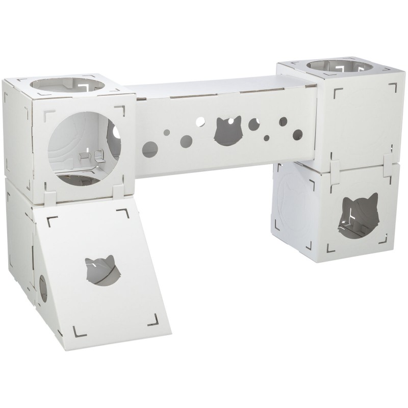 Tiragraffi realizzato interamente in cartone riciclato tutto da graffiare per affilare gli artigli, e puoi montarlo nel modo che preferisci e aggiungere un altro set per ampliarlo. Si monta e smonta facilmente grazie a un semplice sistema a incastro e alle parti pre-piegate e ai fori appositi. La rampa e il tunnel consentono di giocare, nascondersi e rilassarsi