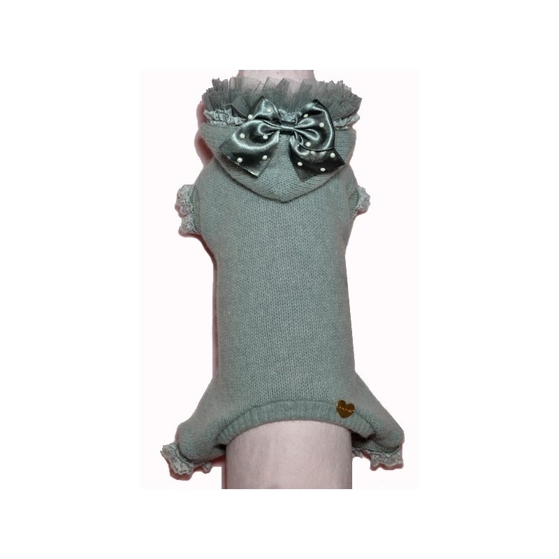 Tutina 4 zampe con cappuccio bordato da pizzo impreziosito da fiocco.