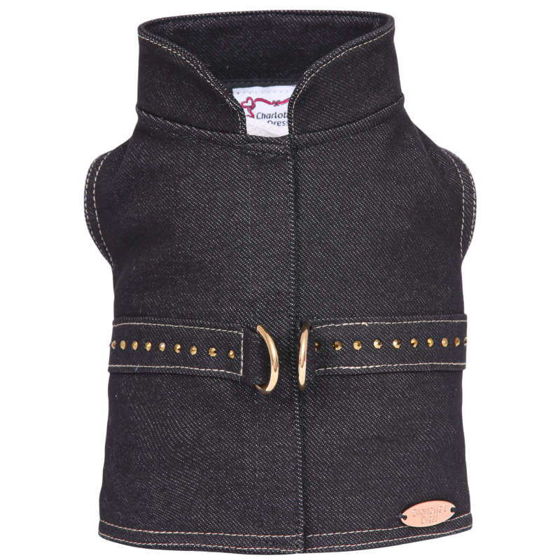Must-have nel guardaroba dei nostri piccoli, giacca pettorina casual-chic in jeans con dettagli Swarovski e fiocco removibile