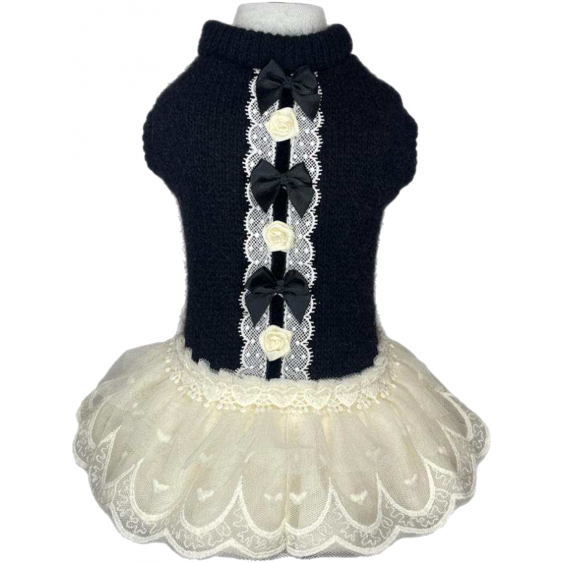 E' in stile bon ton questo abitino nero con fiocchi, roselline e una gonna bianca in tulle ricamata da sogno