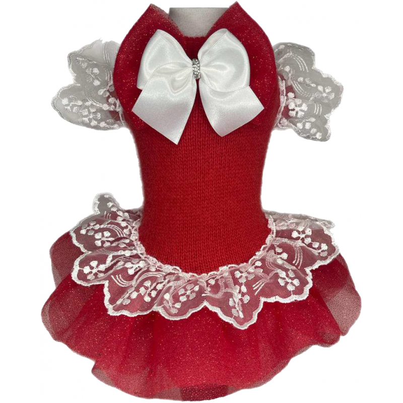 Abito in lana rosso con maniche in pizzo, fiocco bianco e gonna a balze glitter: elegante e prezioso