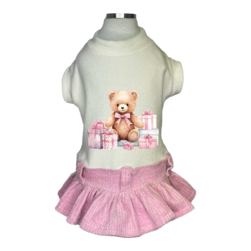 Delizioso vestito in ciniglia con un dolce orsetto tra pacchetti rosa per un look tenero e festoso