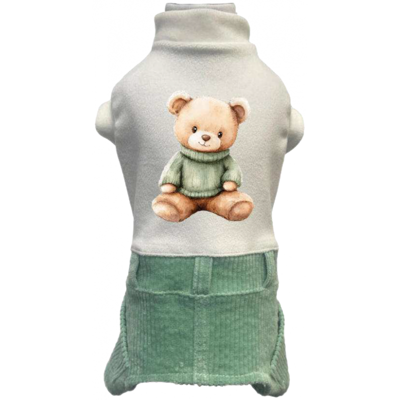 Tutina in ciniglia con l'orsetto più tenero dell'inverno e pantalone in velluto per un look irresistibili