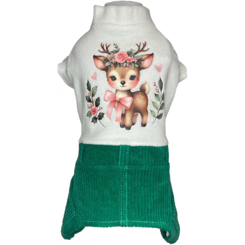 Tutina in ciniglia dolce come una fiaba, con una cerbiatta romantica e pantalone in velluto verde smeraldo