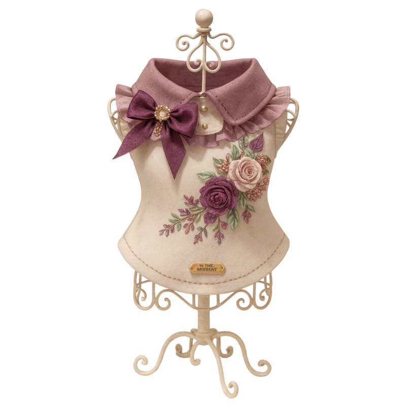 Corpetto color cipria, colletto strutturato con rouches leggere, fiocco prugna impreziosito da dettaglio gioiello.