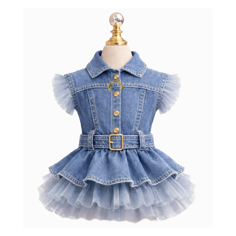 Abitino in denim con manichine con volant in tulle. Gonna a balze in tulle blu, soffice e vaporosa, che crea un effetto tutu raffinato e alla moda.
