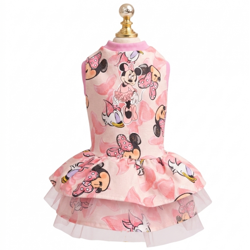 Incantevole abitino realizzato in morbido cotone color rosa pastello. Il design è caratterizzato da una vivace stampa all-over che ritrae le iconiche Minnie e Paperina, impreziosita da un pattern di fiocchi tono su tono.