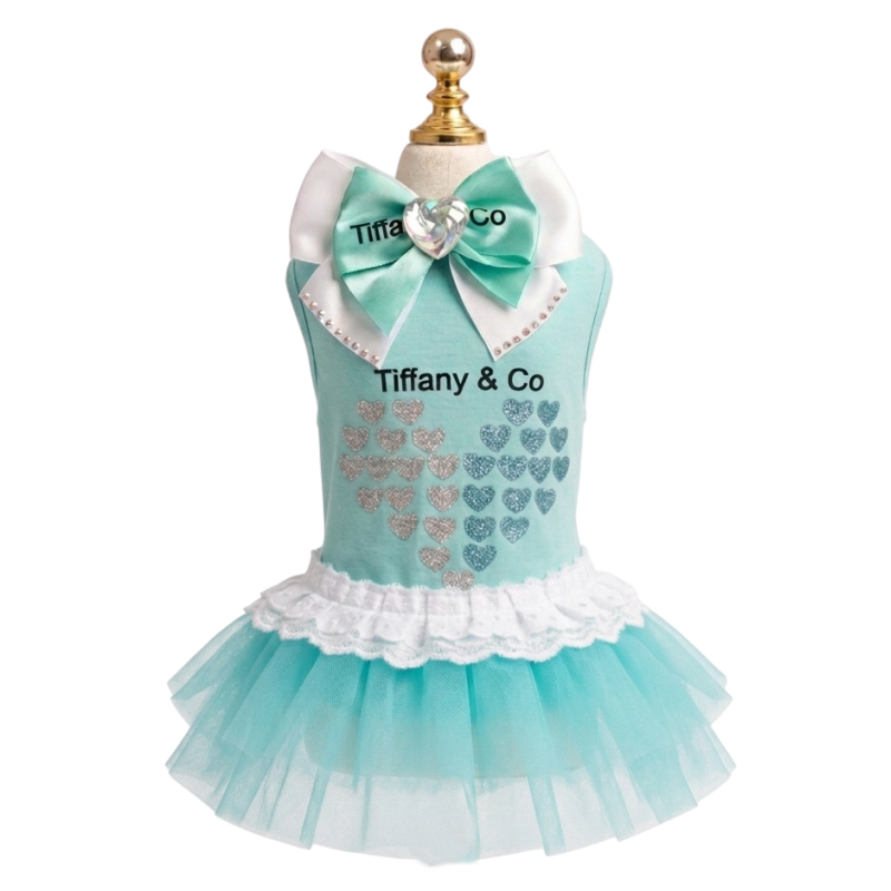 Elegante abitino nell'iconica tonalità verde acquamarina. Il design si distingue per il raffinato maxi-fiocco in raso bicolore, impreziosito da una gemma centrale a cuore e profili in strass luminosi. Con gonna in tulle
