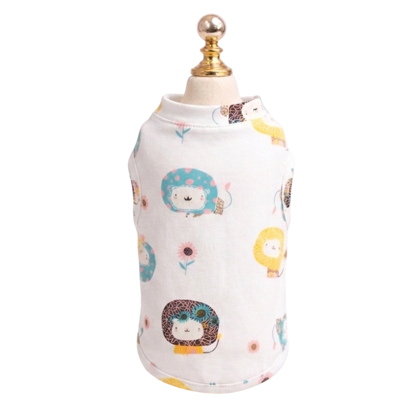 Tshirt leggera e giocosa, realizzato in tessuto bianco con piccoli leoncini colorati e dettagli floreali. La linea essenziale valorizza la stampa vivace, creando un look dolce, fresco e perfetto per le giornate spensierate.