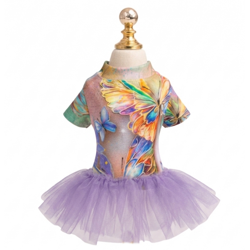 Regala al tuo piccolo amico un look da passerella con l'esclusivo abito Butterfly Dream. Questo capo unico combina l'arte della stampa contemporanea con la leggerezza eterea del tulle, perfetto per occasioni speciali, shooting fotografici o per chi non vuole mai passare inosservato.