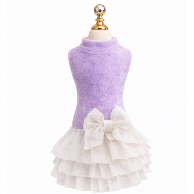 Un abitino da sogno in stile boutique, con corpetto rosa cipria in velluto morbido e una gonna bianca a balze di tulle leggero, impreziosita da un fiocco centrale candido. Perfetto per look romantici e raffinati, ideale per shooting o vetrine di lusso dedicati alla moda pet couture.