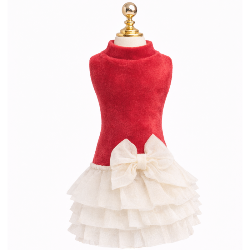 Un abitino da sogno in stile boutique, con corpetto rosa cipria in velluto morbido e una gonna bianca a balze di tulle leggero, impreziosita da un fiocco centrale candido. Perfetto per look romantici e raffinati, ideale per shooting o vetrine di lusso dedicati alla moda pet couture.
