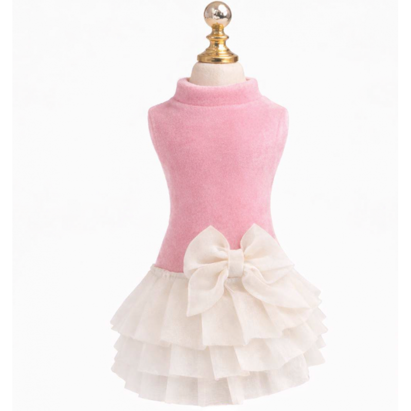 Un abitino da sogno in stile boutique, con corpetto rosa cipria in velluto morbido e una gonna bianca a balze di tulle leggero, impreziosita da un fiocco centrale candido. Perfetto per look romantici e raffinati, ideale per shooting o vetrine di lusso dedicati alla moda pet couture.