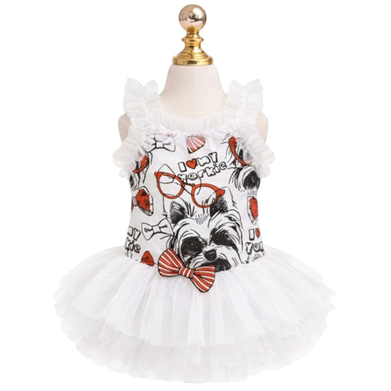 Romantico abitino in cotone bianco, decorato con adorabili volti di Yorkshire Terrier, cuoricini rossi e fiocchi stampati con gonnellina in tulle