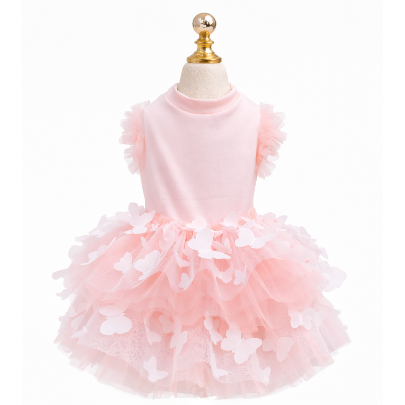Un piccolo capolavoro di tulle rosa cipria e farfalle, dove la leggerezza del volo incontra la grazia sartoriale.