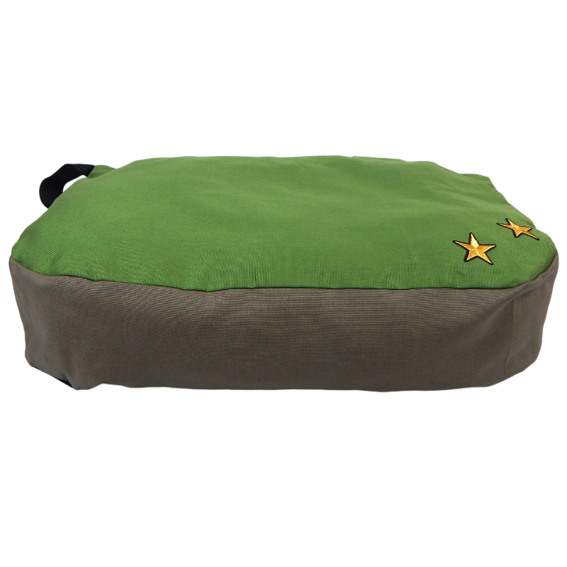 Un morbido cuscino da piazzare ovunque tu voglia! Dotato di una maniglia per spostarlo rapidamente..o per lasciarlo trascinare direttamente dai vostri instancabili amici pelosi! Sui toni del verde militare..con tanto di stelle.