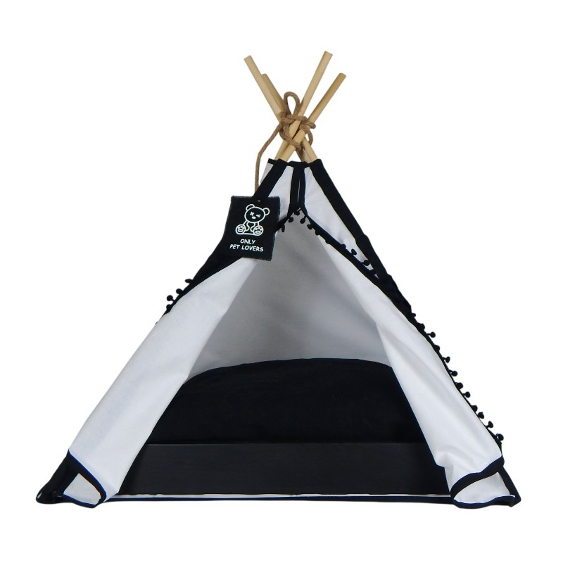 Una simpatica tenda in stile nativi americani. All'interno una struttura cuccia in legno e all'esterno una tenda un po' pop.